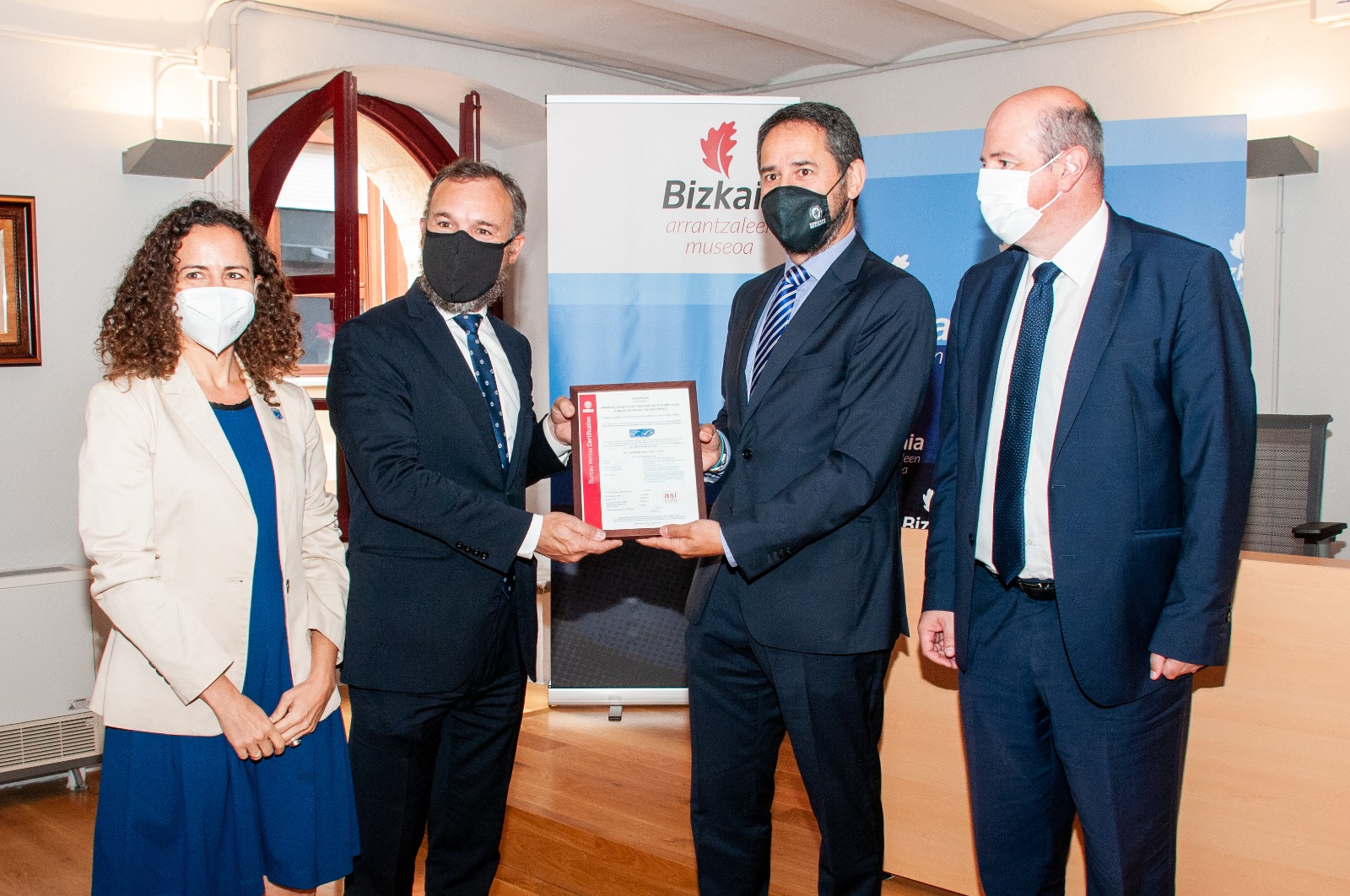 The representative of Bureau Veritas, Ricardo Fernández, gives the certificate to Borja Soroa, president of ANABAC, in the presence of the Vice-Minister of Agriculture, Fisheries and Food Policy, Bittor Oroz and the director of MSC in Spain and Portugal, Laura Rodríguez.